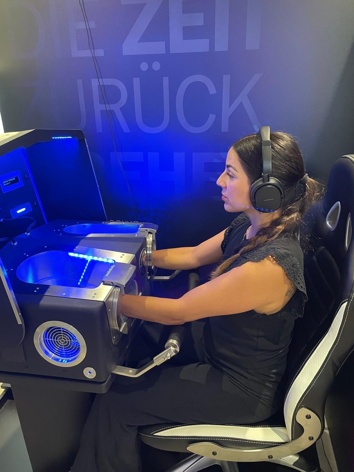 Anwender sitzen bequem vor dem Gerät, legen die Hände auf die Kühlflächen und genießen die Anwendung von nur 5x2 Minuten mit kurzen Pausen.